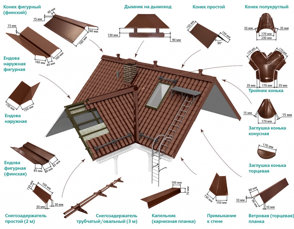 Угловые элементы предназначены для защиты стыков между кровельными листами. Фигурный конек выполняет аналогичную функцию, что и плоский конек, но обладает более эстетичным внешним видом. Кроме того, производство такого элемента требует большего количества материала.